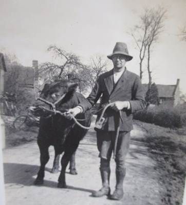 Vic Rudge leading a cow along the lane with Benges Farm visible to the left and Ivy House to the right.