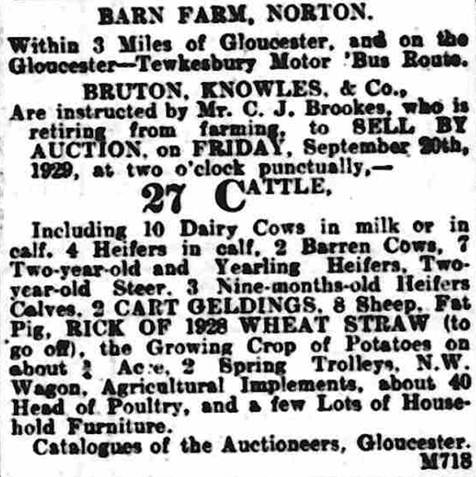 The Gloucester Journal newspaper of 26 September 1925 advertised; “Barn Farm, Norton, within 3 miles of Gloucester and on the Gloucester and Tewkesbury motor bus route. Bruton, Knowles and Co, are instructed by Mr C J Brookes, for whom they have let the farm, to sell by auction, on Friday, October 2nd, 1925, at one o’clock punctually; - 27 cattle including cow and calf, heifer and lugteat, 9 well bred dairy cows in milk or in calf, pair fresh two year old heifers, 11 coming two year old yearling heifers and steers, weaned heifer calf, shorthorn bull, 4 horses, quantity oat straw, harness house, harness, governess car, ralli car, 3 capital trollies, agricultural implements, blacksmiths tools, about 3 tons potatoes, and 60 head of poultry”.