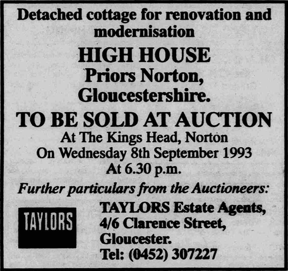 The Citizen newspaper, 14 October 1993; “Sales of country houses are still attracting a good deal of attention. Bidding was brisk at the recent auction of High House, Priors Norton. It attracted a good fathering at the Kings Head in Norton where auctioneer Richard Courtney Lord, on behalf of Gloucester estate agents Taylors, eventually knocked it down to a bid of £62000 to a young couple who plan to renovate the property and live there. Parts of the house are believed to date back 400 years. Bertie Armstrong, manager of Taylors’ Gloucester office, revealed there had been great interest in the house before the auction. He said many applicants had visited High House and he felt that it proved the point that if the property was right it would always sell at auction”.