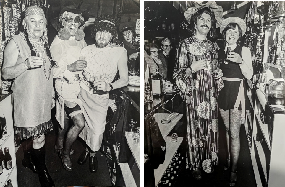 New Year's Eve fancy dress party at the Red Lion, year unknown. Joan Mitchell to the left and John Mitchell and Sheila Broughton on the right.
