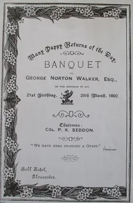 Born on 29 March 1871 Charles' eldest child, son George Norton Walker, inherited the Norton Court Estate upon his father's death. George's 21st birthday was reported in the local press; "Mr George Norton Walker, eldest son of Mr C B Walker, of Wootton House, Gloucester, came of age on Tuesday, and the auspicious occasion was celebrated in a suitable and gratifying manner at a banquet which took place at The Bell Hotel in the evening. Mr C B Walker was unable to be present at the banquet, being in Egypt, and the chair was taken by Col P K Seddon, one of the directors of Messrs Price, Walker and Company. ... The banquet over, the rest of the evening was devoted to toast and song and the making of presentations. ... On behalf of the clerical staff, the chairman presented Mr Walker with a silver inkstand; Mr James Smith, on behalf of the saw mlll employees, handing the guest of the evening a fold pencil case; whilst the labourers proscribed for a meerschuam pipe and cigar case, which were duly presented to Mr Walker. ... On Tuesday, the tenants of the Norton and Sandhurst estates presented Mr G N Walker with a silver salver, as a mark of respect, on his coming of age. The gift was placed on his breakfast table".